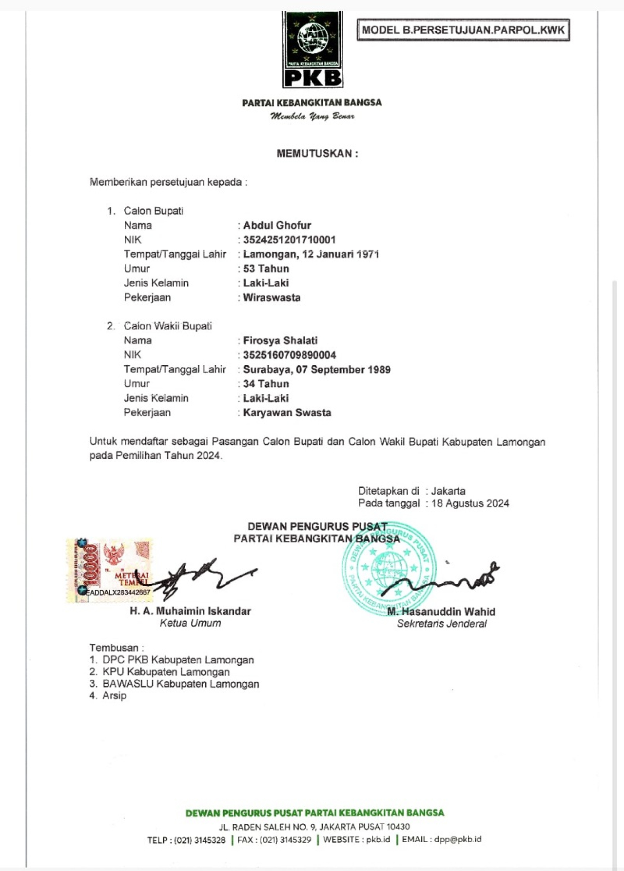 B1 KWK atau Model B. Persetujuan. Parpol. KWK yang ditandatangani langsung oleh Ketum, H. Muhaimin Iskandar dan Sekretaris Jenderal M. Hasanuddin Wahid.