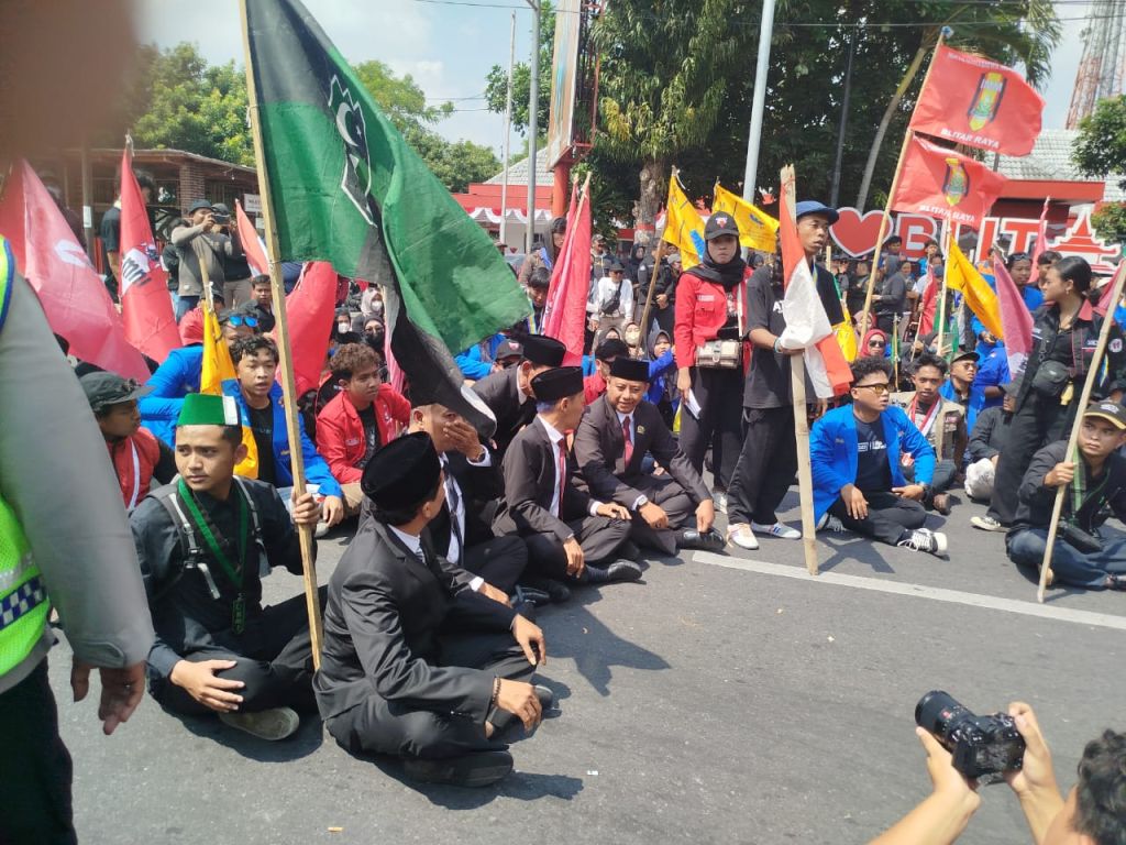 SURABAYAPAGI.COM, Blitar - Ratusan mahasiswa pada Jumat (23/8) pagi menggeruduk Kantor DPRD Kota Blitar di jalan Achmad Yani Kota Blitar bertepatan dilantiknya 25 anggota DPRD Kota Blitar yang baru untuk periode 2024 s/d 2029.