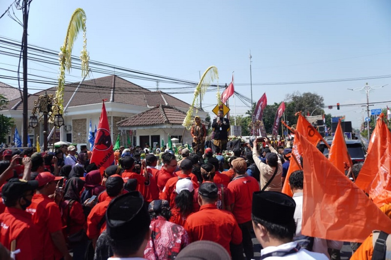 Dari pantauan di lokasi, momen pendaftaran calon petahana ini digelar secara meriah dengan diiringi lantunan salawat badar, pertunjukan tarian tradisional, hingga barongsai.