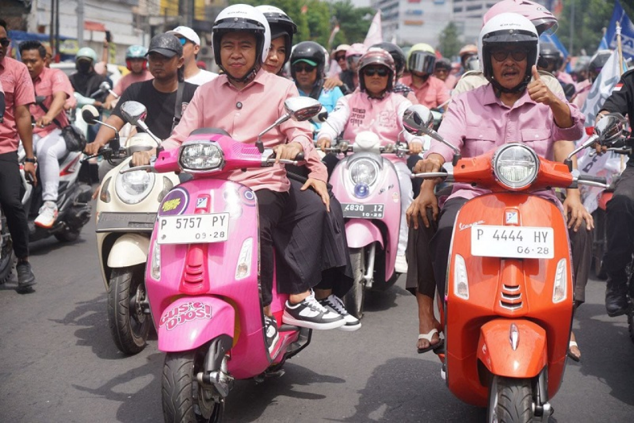 SURABAYAPAGI.com, Jember - Bakal calon bupati Jember Muhammad Fawait atau lebih dikenal gus Fawait bersama pasangannya Djoko Susanto, Rabu 28 Agustus 2024 mendaftar ke KPU Jember. Dengan diikuti puluhan ribu pendukungnya, politisi Gerindra tersebut menggunakan kendaraan sepeda listrik menuju KPU kabupaten Jember.