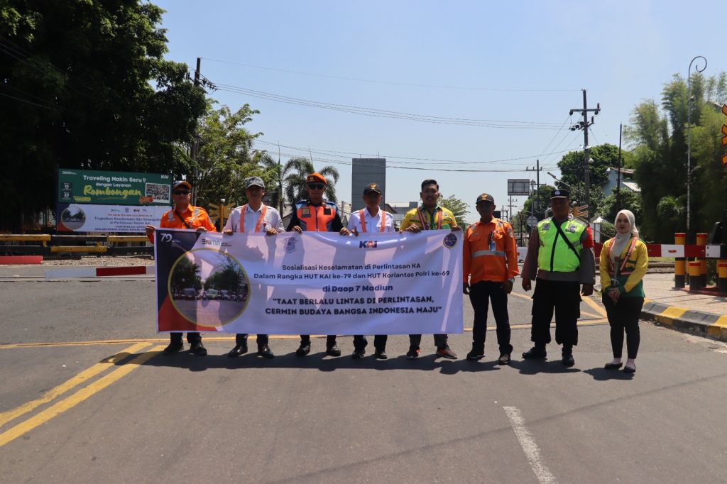 SURABAYAPAGI.COM, Blitar - Bertepatan peringati HUT KAI ke 79 dan HUT Korlantas Polri ke 69, PT KAI Daop 7 Madiun dan Korlantas Polri bekerja sama gelar kegiatan kampanye untuk patuhi peraturan berlalu lintas, khususnya di perlintasan kereta api, pada Kamis (19/9) yang digelar di sebidang JPL 138, Jalan Yos Sudarso Kota Madiun, dan hal serupa akan digelar serentak pada 13 perlintasan se Jawa dan Sumatra.