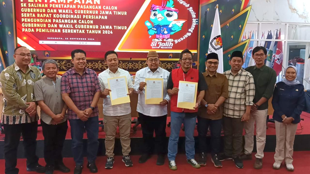 SURABAYAPAGI.COM, Surabaya - Komisi Pemilihan Umum (KPU) Jawa Timur resmi menetapkan tiga pasangan calon gubernur-wakil gubernur yang berlaga di Pilkada serentak tahun 2024. Hal ini setelah KPU melakukan verifikasi berkas administrasi dan persyaratan tiga paslon yang mendaftar sejak 29 Agustus 2024 lalu.
