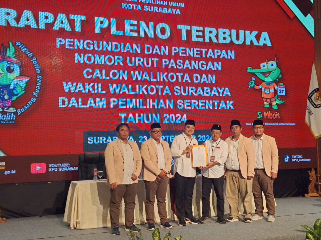 Penetapan nomor tersebut berdasarkan undian yang digelar didalam rapat pleno terbuka pengundian dan penetapan nomor urut pasangan calon wali kota dan wakil wali kota Surabaya dalam pemilihan serentak 2024, Senin (23/9).