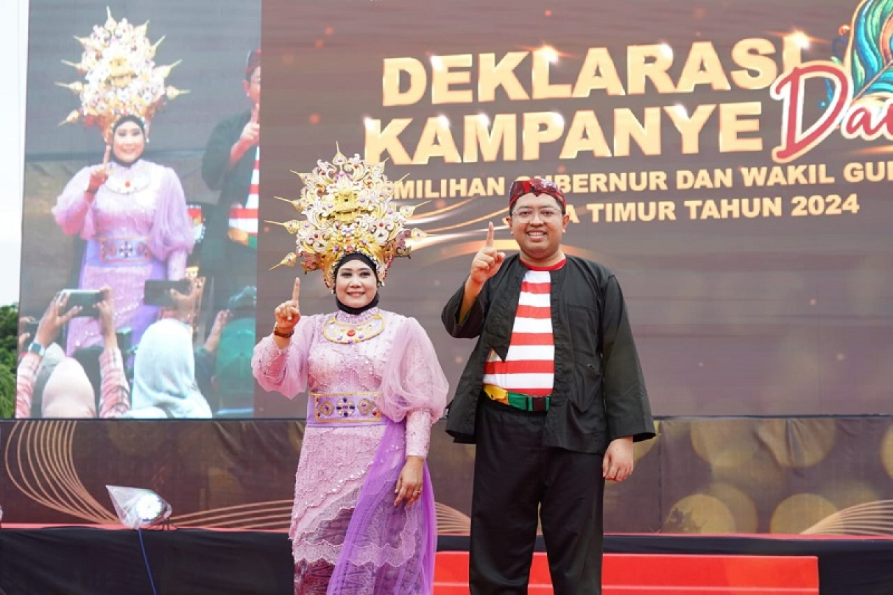 Pasangan yang diusung PKB ini hadir dalam kampanye damai yang digelar KPU Jatim di lokasi Tugu Pahlawan Surabaya, Selasa (24/09/2024).