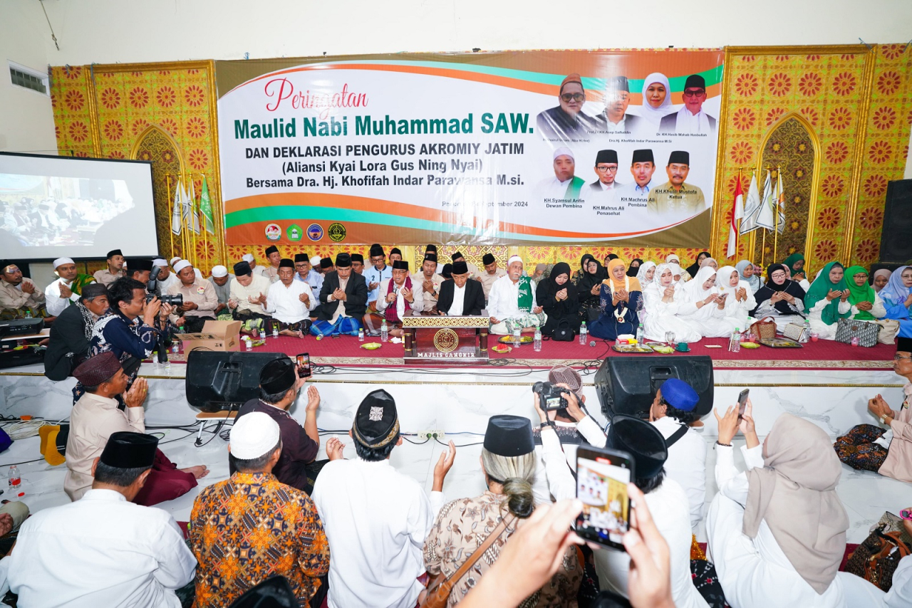SURABAYAPAGI.COM, Pasuruan - Calon Gubernur Jawa Timur nomor urut 2 Khofifah Indar Parawansa hadir dalam peringatan Maulid Nabi Muhammad SAW sekaligus Deklarasi Aliansi Kyai, Lora, Gus, Ning dan Bu Nyai (Akromy) Jawa Timur di Pasuruan, Selasa (24/9/2024) malam.