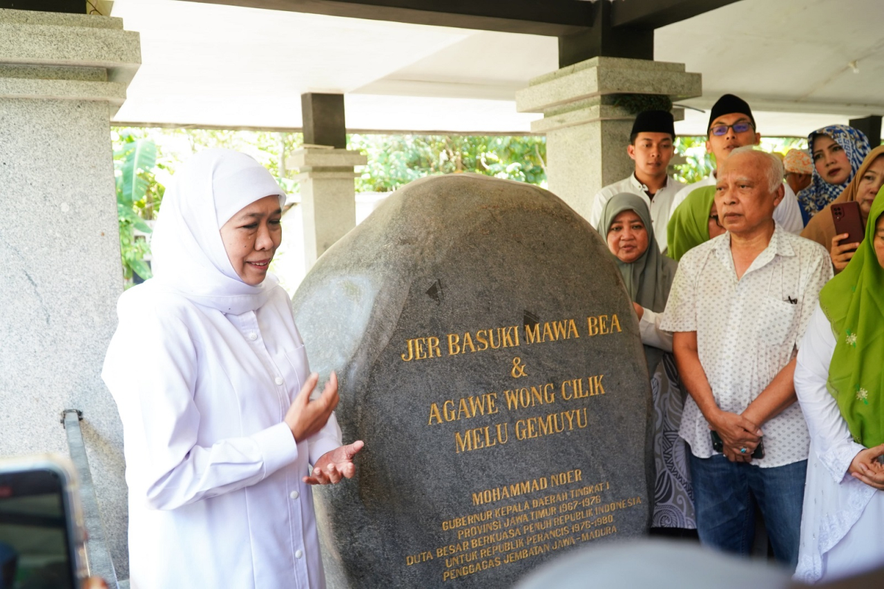 Tidak hanya itu, Khofifah kemudian menekankan tentang kalimat yang tertera di batu prasasti di komplek Makam Gubernur M Noer. Jer Basuki Mawa Beya Yang artinya adalah Sebuah kesuksesan atau keberhasilan memerlukan pengorbanan. Dan Agawe Wong Cilik Melu Gemuyu yang artinya membuat rakyat kecil ikut bahagia.