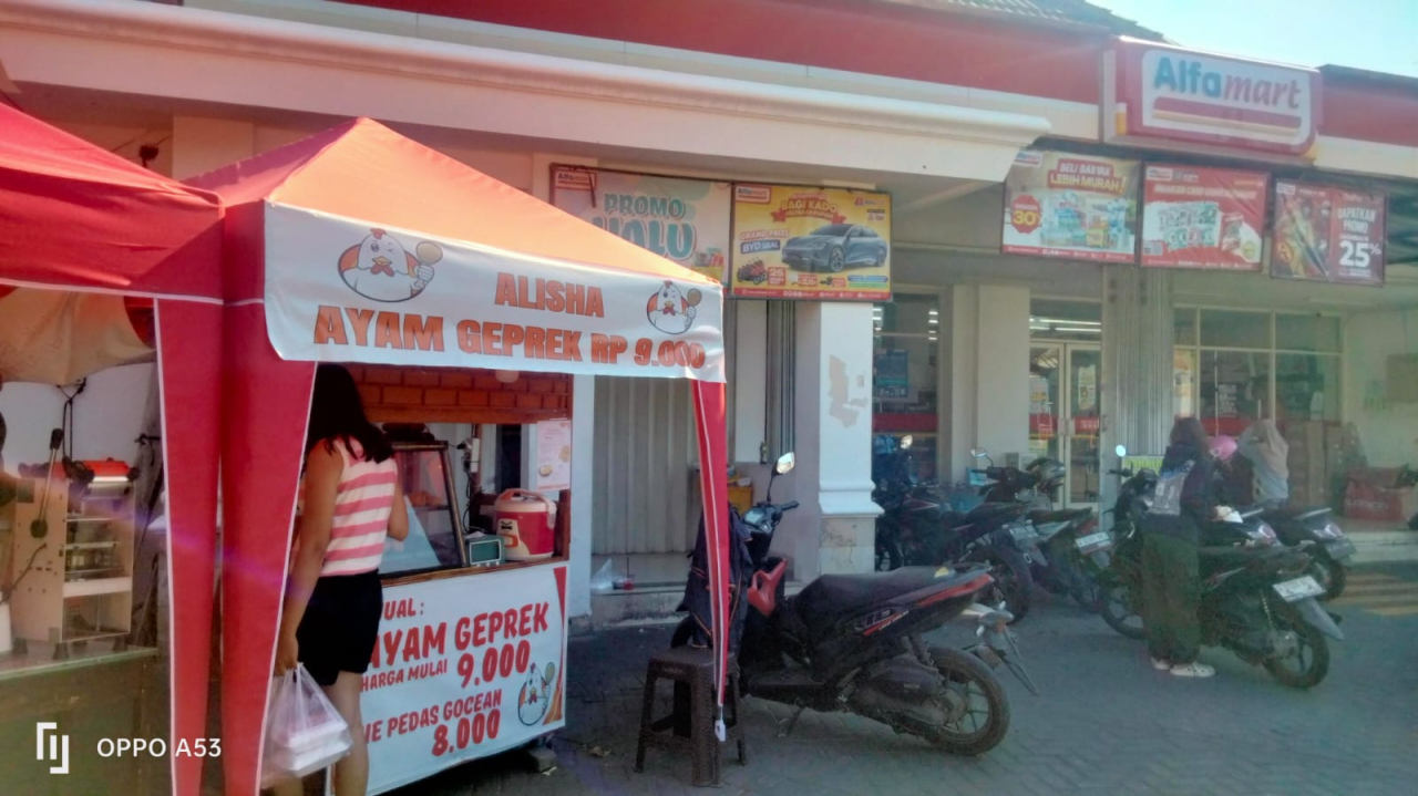 Penjual ayam goreng geprek saat ini mudah ditemui. Salah satunya, ayam goreng geprek Alisha berlokasi di depan Alfamart Tivoli Bumi Citra Fajar Sidoarjo