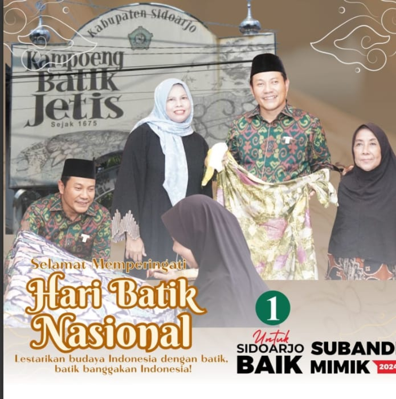 SURABAYAPAGI.COM, Sidoarjo – Dalam rangka peringatan Hari Batik Nasional di calon Bupati Sidoarjo Subandi untuk berkunjung ke kawasan Kampung Batik Jetis di Kelurahan Lemahputro, Sidoarjo, Rabu (2/10/2024).