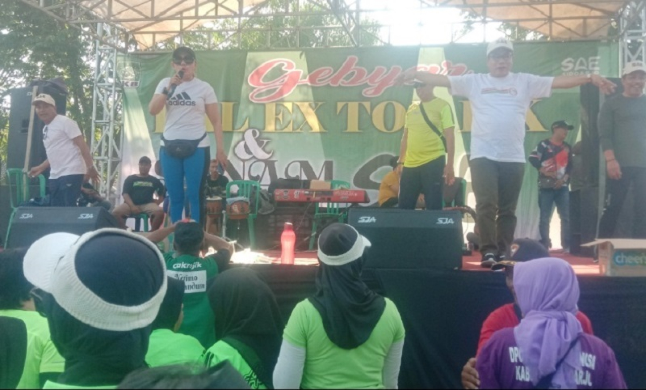 Ratusan kaum perempuan yang mengikuti senam gembira ini tampak begitu bersemangat mengikuti gerak instruktur, termasuk Ketua Tim Pemenangan SAE H.Usman M.Kes sambil menunggu kedatangan Mas Iin yang berada di atas panggung paling depan.