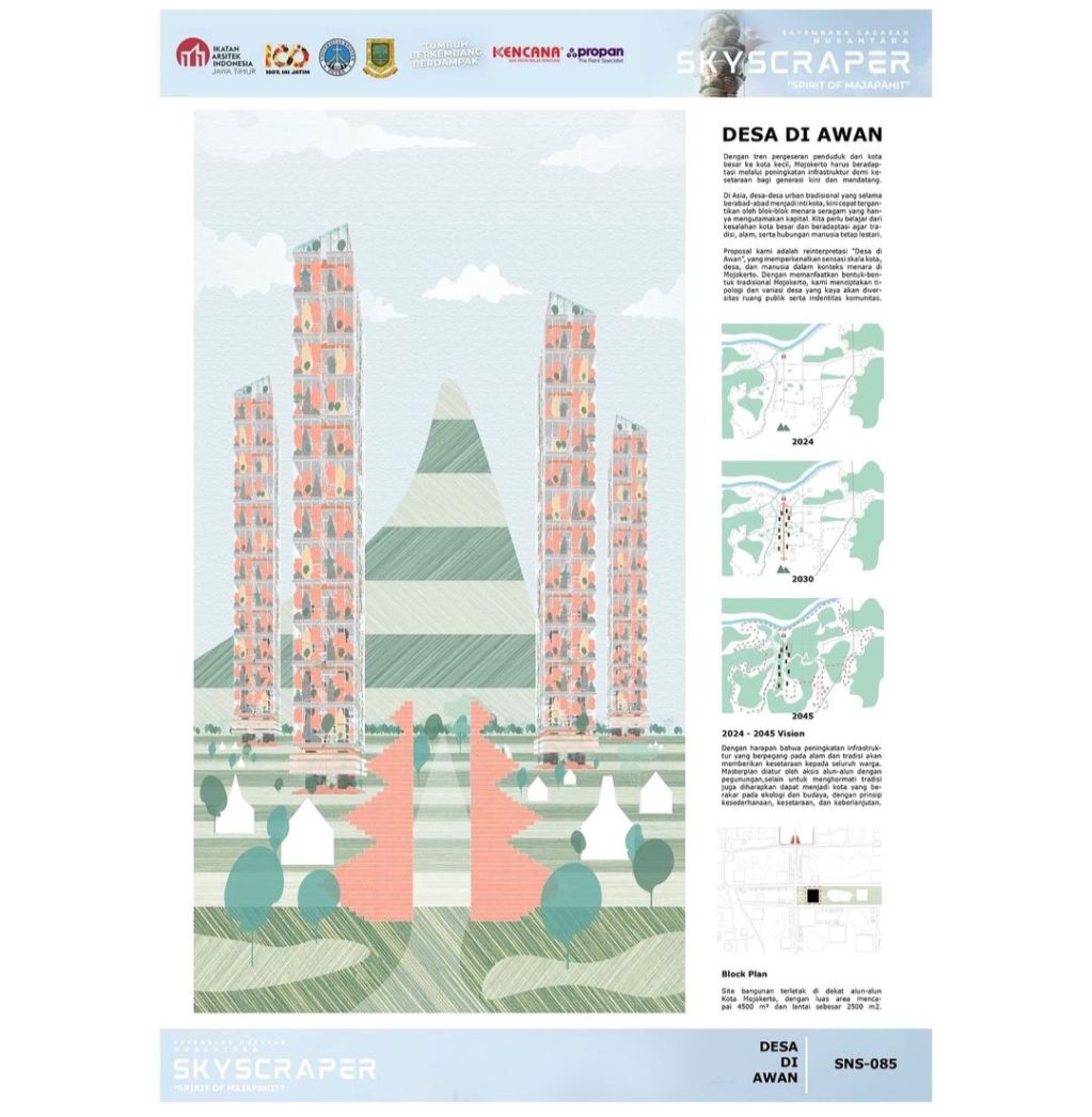 Ide desain gedung pencakar langit kode SNS 085 ini menginterpretasi Desa di Awan yang memperkenalkan sensasi skala kota, desa dan manusia dalam konteks menara di Kota Mojokerto.