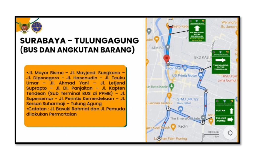 Berikut ini daftar jalur yang dapat dilalui bus dan angkutan barang: Surabaya menuju Tulungagung melewati jalur Jl Mayor Bismo – Jl. Mayjend Sungkono – Jl. Diponegoro – Jl. Hasanudin – Jl. Teuku Umar – Jl. Ahmad Yani – Jl. Letjend Suprapto – Jl. DI. Panjaitan – Jl. Kapten Tendean – Jl. Supersemar – Jl. Perintis Kemerdekaan – Jl. Sersan Suharmaji.