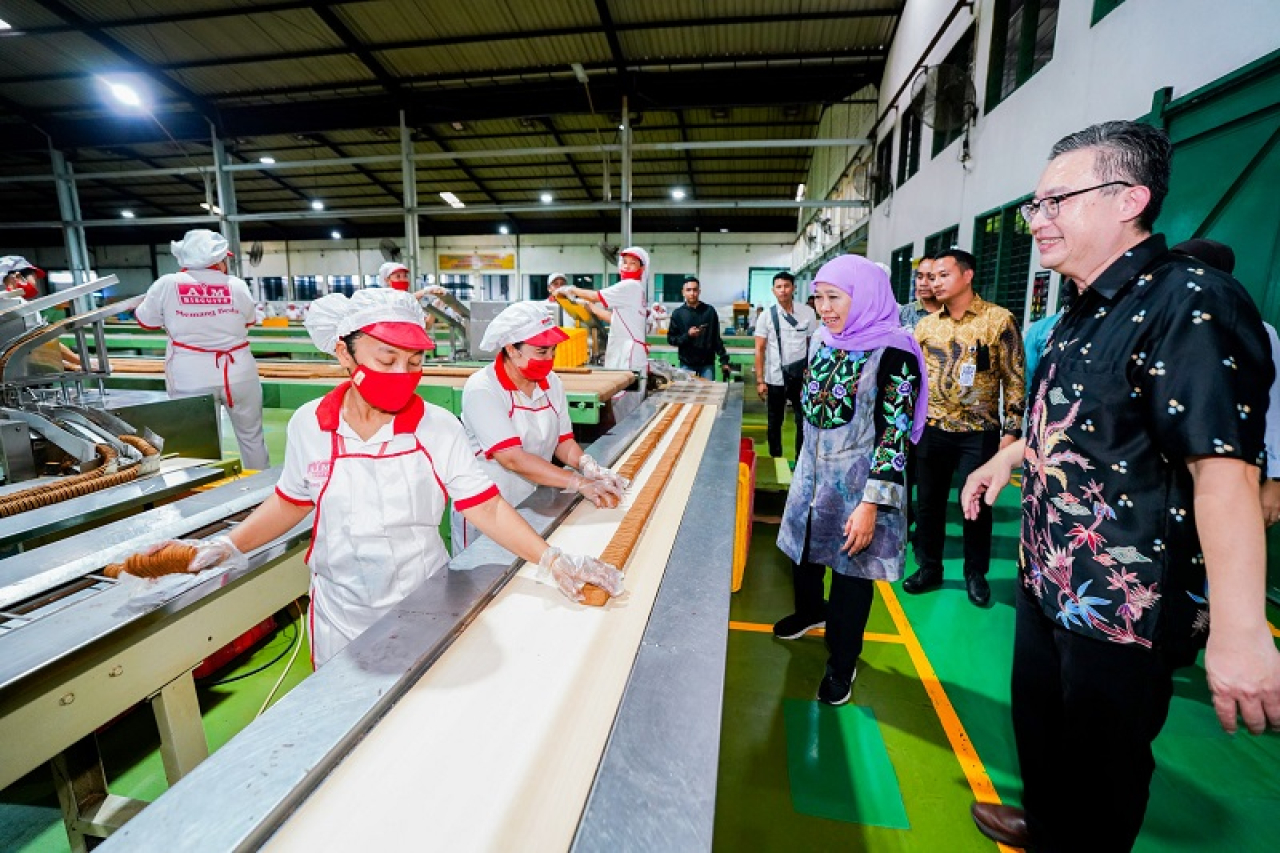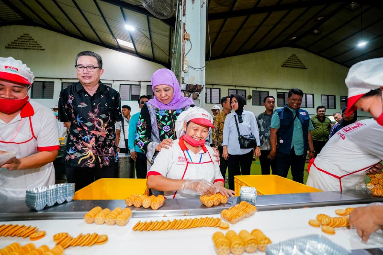 Dalam kunjungan ini, Khofifah tak hanya menyapa pekerja. Melainkan juga melihat langsung proses produksi hingga pengemasan produk AIM Biskuit.