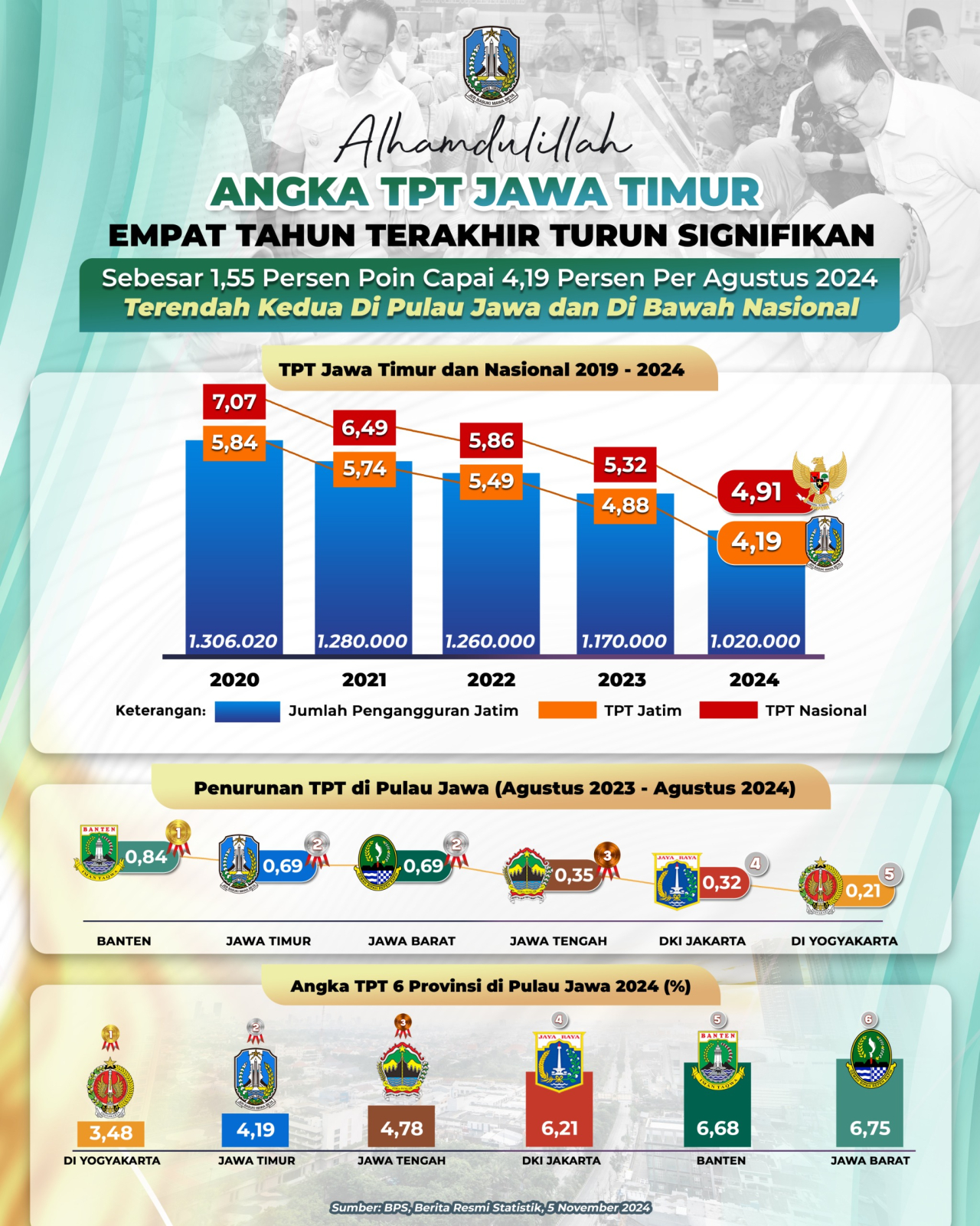 Berdasarkan data Badan Pusat Statistik (BPS) yang rilis 5 November 2024, TPT Jawa Timur pada Agustus 2024 berada di angka 4,19 persen atau 1,02 juta dan turun 0,69 persen poin dibandingkan TPT Agustus 2023 yaitu 4,88 persen atau 1,17 juta.
