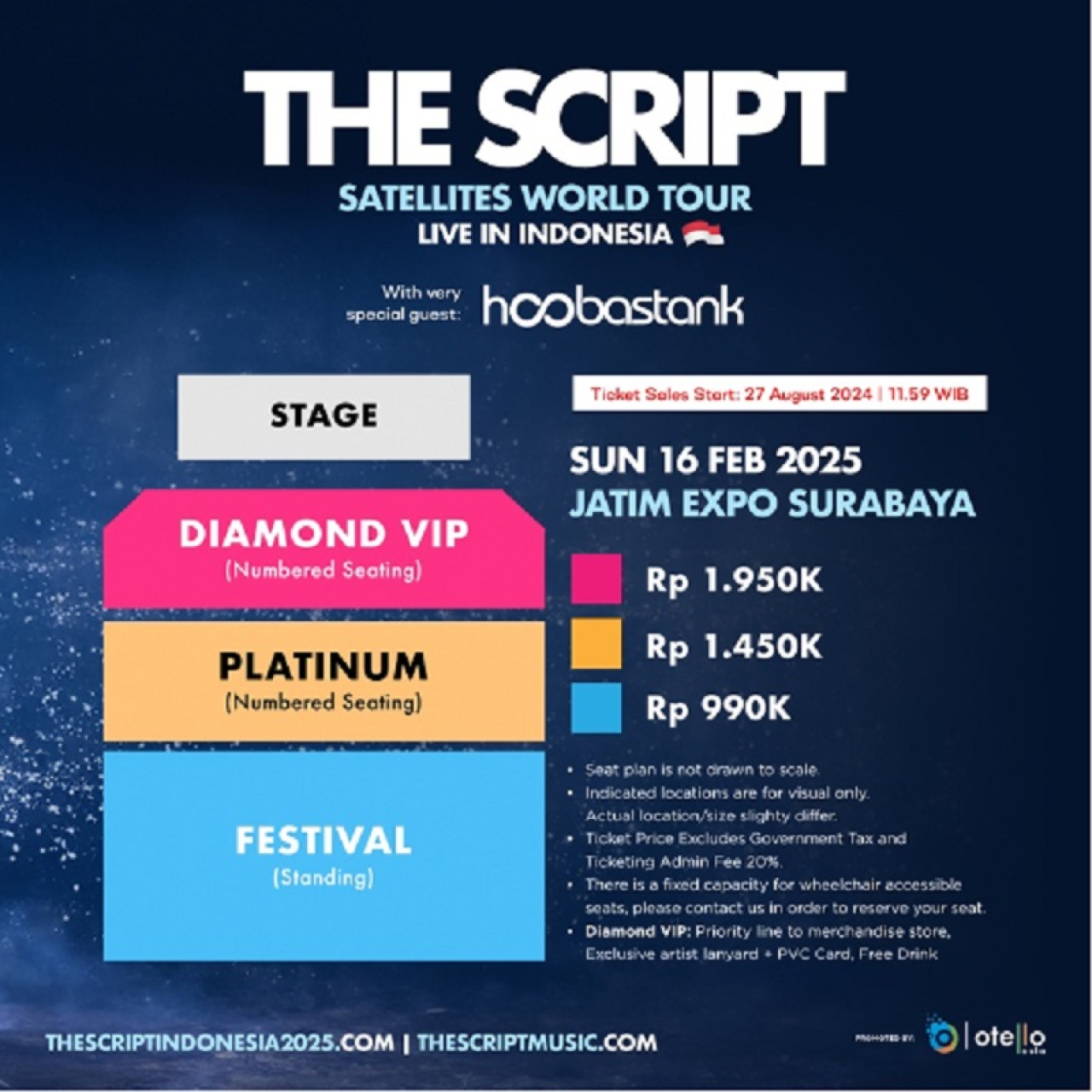 Penjualan tiket The Script Satellites World Tour di Jakarta & Surabaya mulai dijual pada hari Selasa, 27 Agustus 2024, pukul 11.59 WIB secara eksklusif di www.thescriptindonesia2025.com