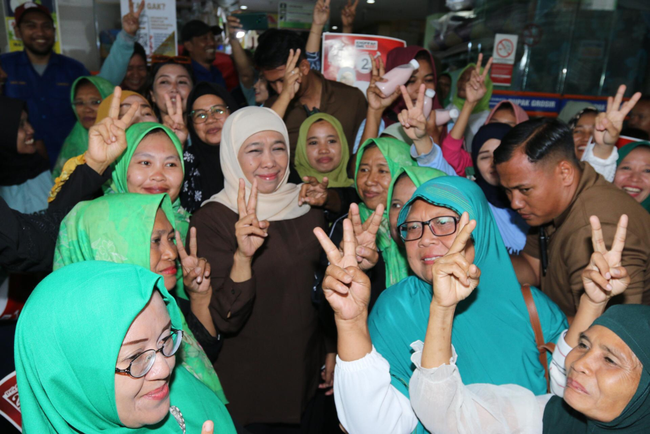 Dengan ramah, Calon Gubernur Khofifah menyapa serta mendengarkan keluhan dan menyerap aspirasi para pedagang di area Dupak Grosir.