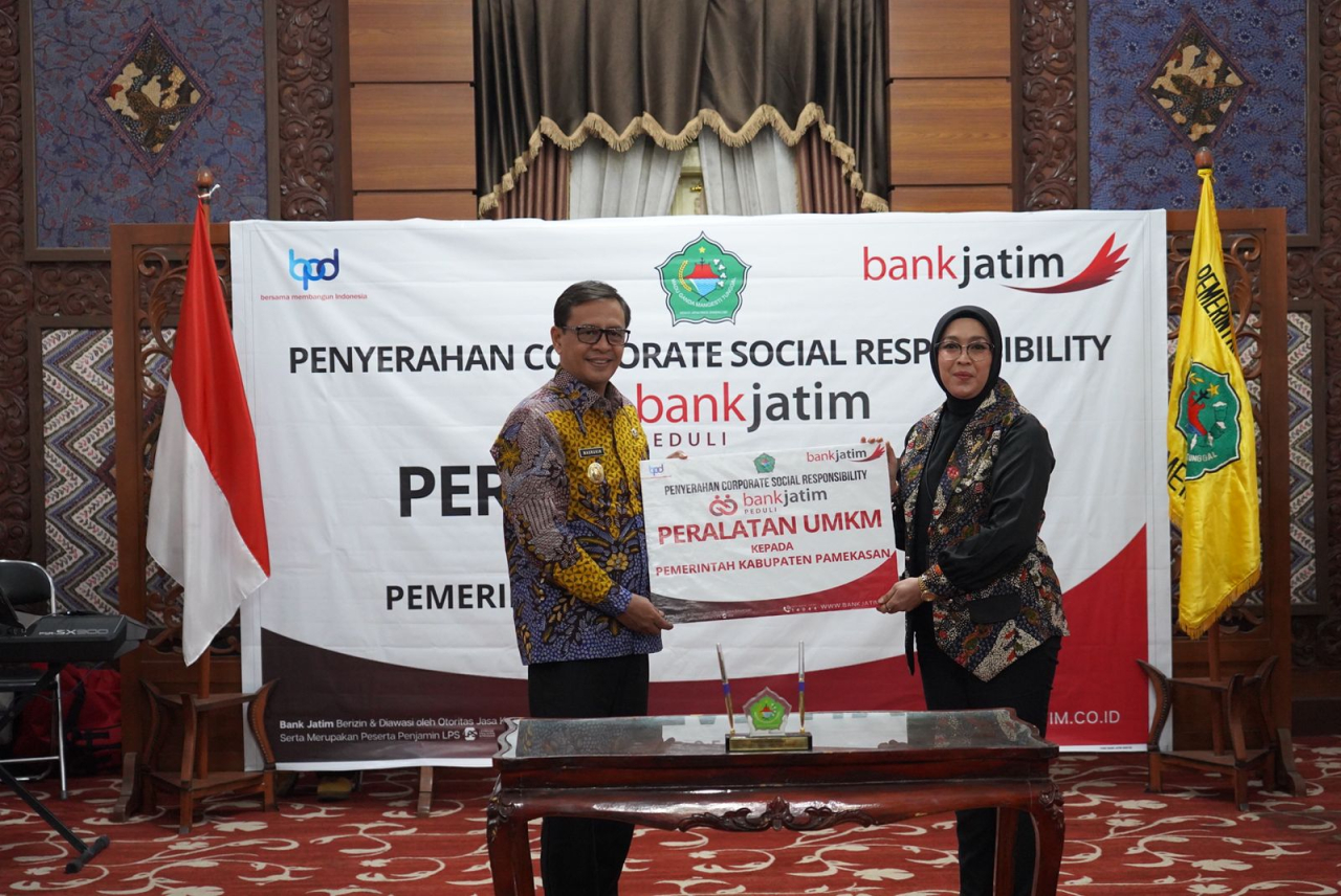 SurabayaPagi, Pamekasan - Sebagai wujud upaya mendukung kemajuan UMKM, PT Bank Pembangunan Daerah Jawa Timur Tbk (Bank Jatim) baru saja menyerahkan bantuan Corporate Social Responsibility (CSR) kepada Pemerintah Kabupaten Pamekasan berupa berbagai macam peralatan UMKM.