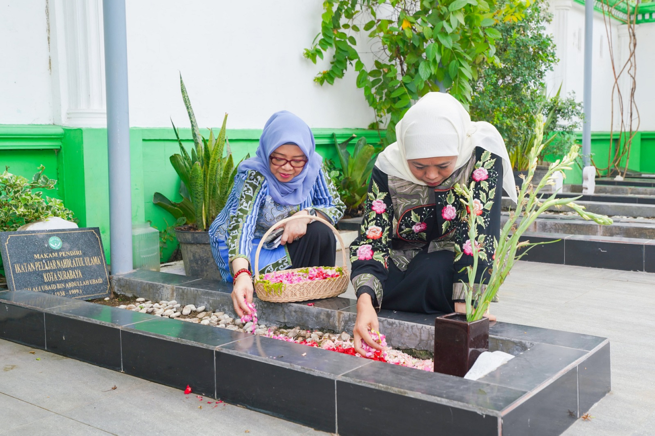 Bersama tim dan juga diantar dhuriyah Kiai Wahab, seperti KH. Hasib Wahab, KH Rokib Wahab, Gus Mujib, Khofifah berkirim tahlil dan juga doa di pusara Kiai Wahab. Dengan khidmat dan penuh ta’dhim Khofifah menabur bunga di pusara Kiai Wahab.
