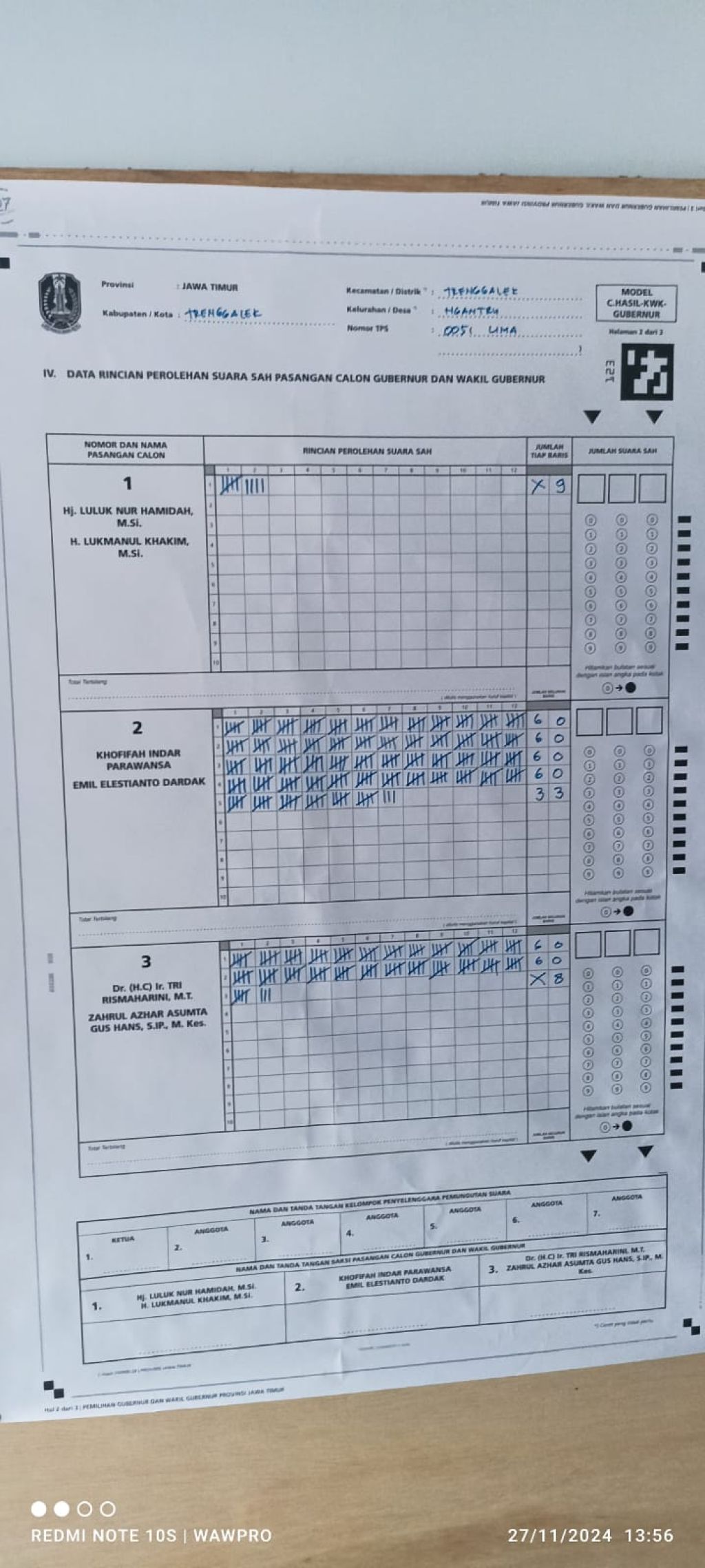 "Kami sudah melihat langsung proses penghitungan seluruh surat suara yang dicoblos, hasilnya pasangan nomor dua lebih unggul. Alhamdulillah seluruh proses pencoblosan hingga perhitungan berjalan dengan lancar," kata Pak Munib yang merupakan tokoh warga Ngantru (27/11/2024).