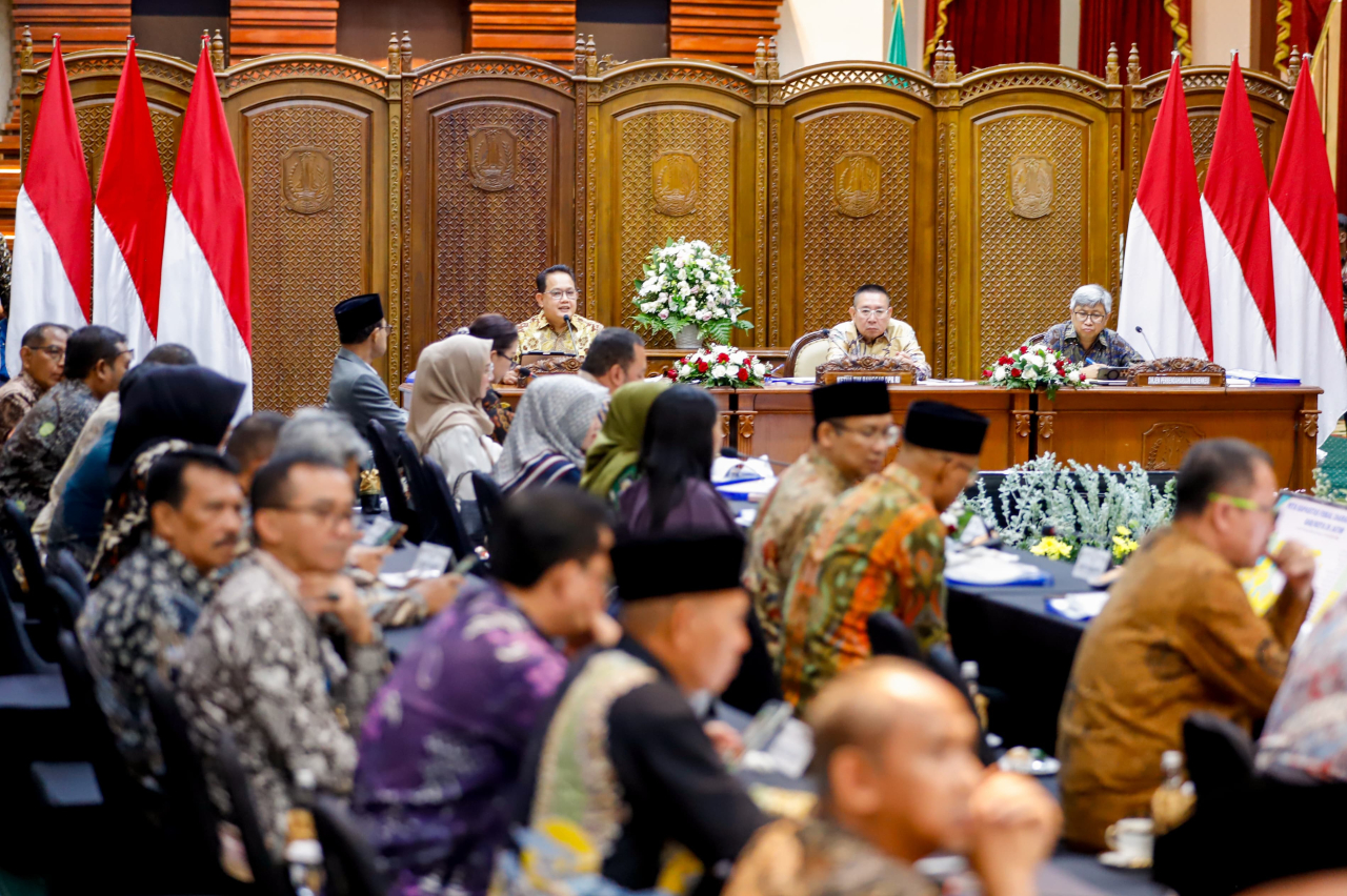 SURABAYAPAGI, Surabaya - Penjabat (Pj.) Gubernur Jawa Timur Adhy Karyono menerima kunjungan kerja (Kunker) dan Rapat Dengar Pendapat (RDP) Tim Badan Anggaran (Banggar) DPR-RI dengan Pemprov Jatim dan Pemerintah Daerah (Pemda) se-Jawa Timur membahas terkait dengan perekonomian dan fiskal Jatim tahun 2024 di Gedung Negara Grahadi Surabaya, Kamis (28/11).