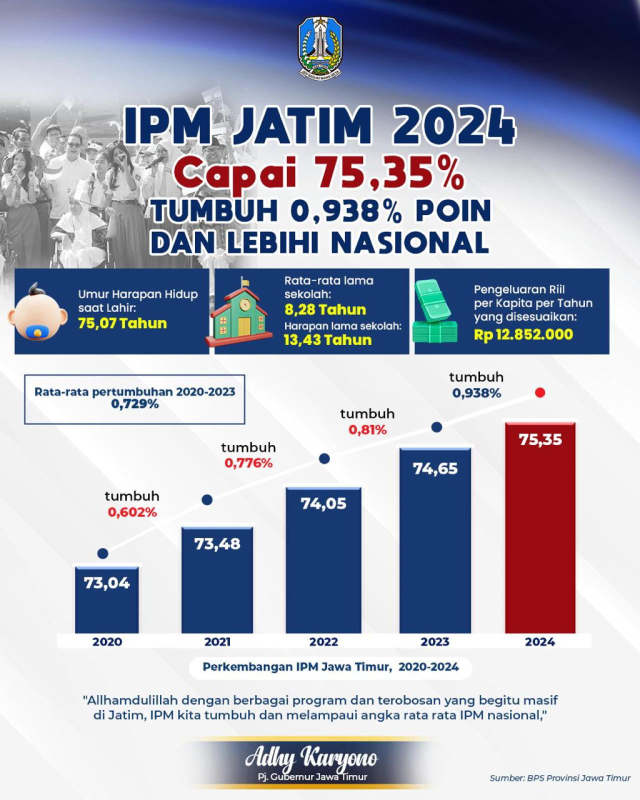 Penjabat (Pj.) Gubernur Jawa Timur Adhy Karyono mengungkapkan bahwa status capaian IPM Jatim masuk kategori tinggi dimana pada rentang 70-80 persen. Bahkan persentasenya tumbuh berada pada angka 75,35 persen ini di atas IPM nasional yang mencapai 75,02 persen.