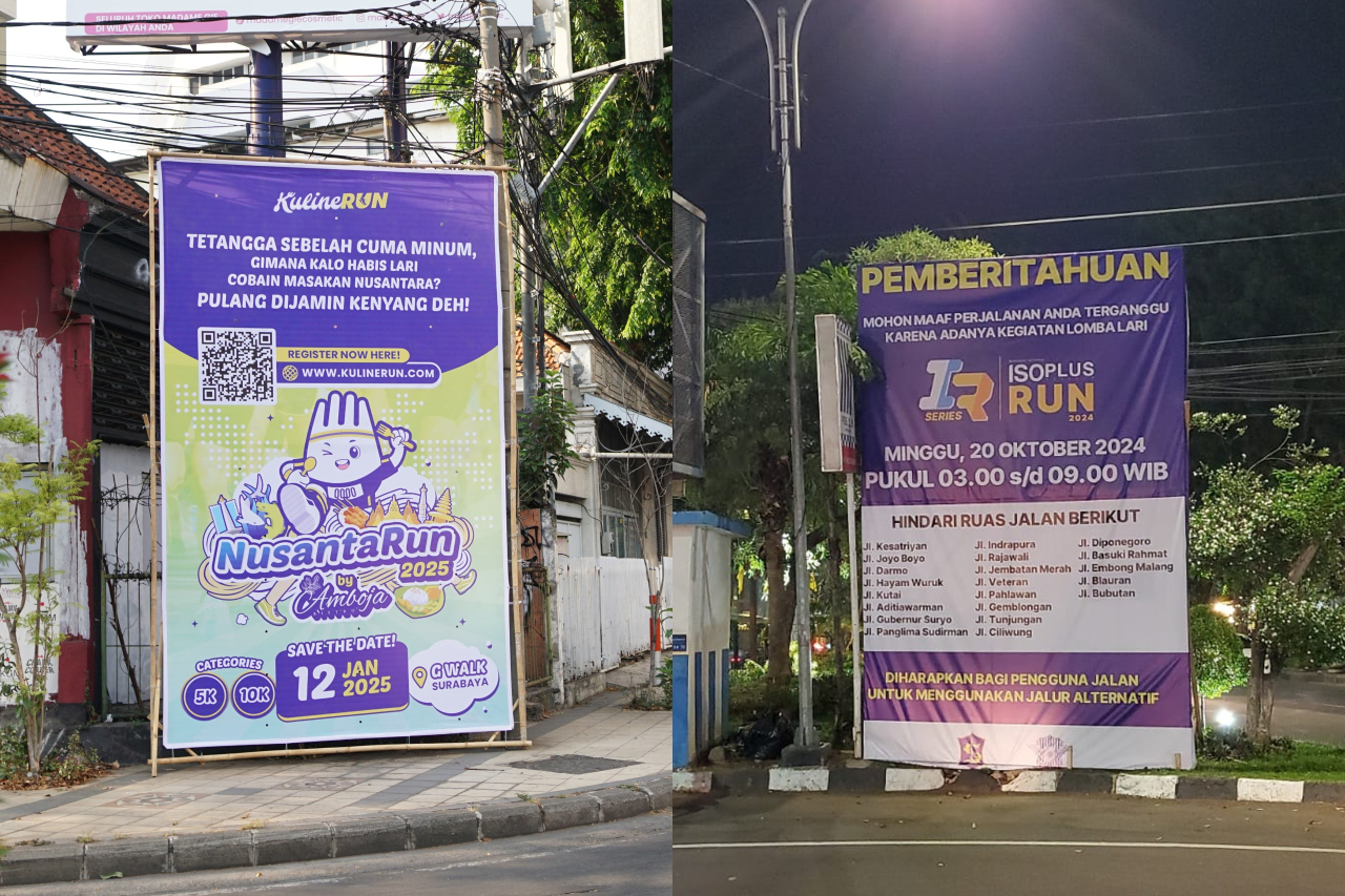 SurabayaPagi, Surabaya, Tahun 2024 ini akan menjadi saksi dari banyaknya acara lari yang diadakan oleh Komunitas maupun Perusahaan. Yang membuat menarik adalah ditengah-tengah Isoplus RUN berjalan, ada iklan Baliho serupa milik Kulinerun yang muncul disamping baliho tersebut.