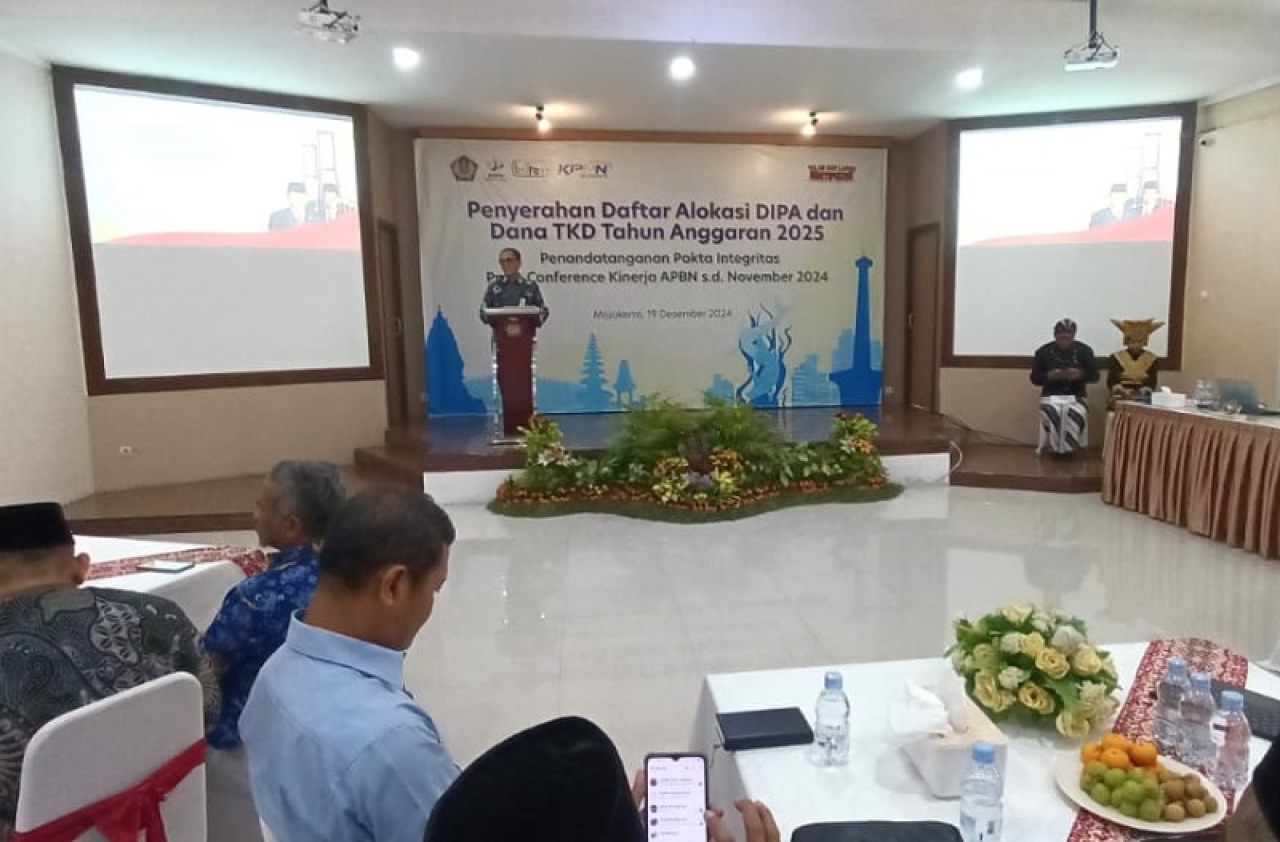 SURABAYAPAGI.com, Mojokerto - KPPN Mojokerto menggelar press conference akhir tahun 2024 dan penyerahan alokasi DIPA K/L serta Transfer ke Daerah (TKD) tahun anggaran 2025, di Aula Lantai II, Kantor KPPN Mojokerto, Kamis (19/12/2024).
