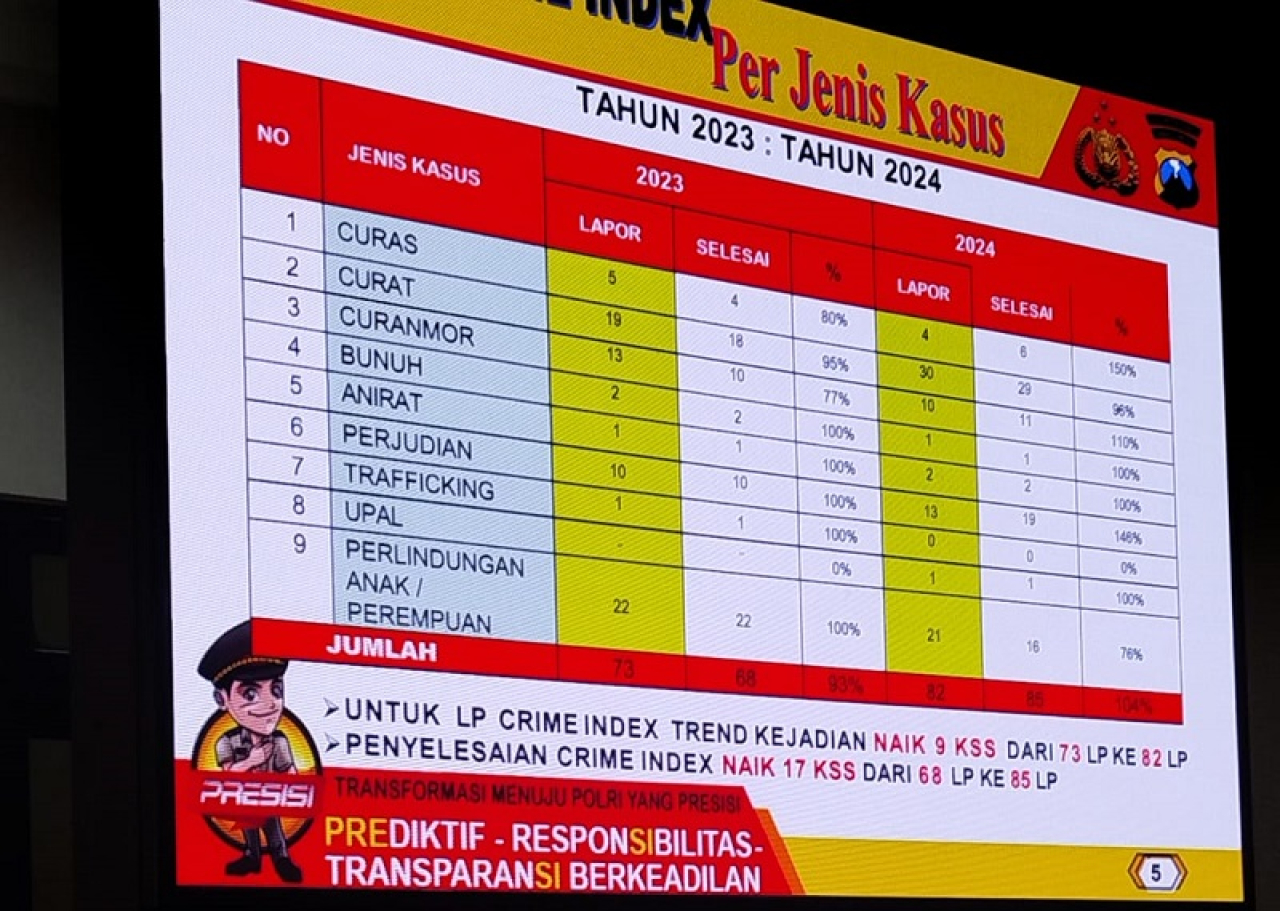 Dalam pemaparanya AKBP Wiwit menyampaikan dari data penyelesaian kasus di Satreskrim berhasil mengalami peningkatan selama tahun 2024 dibandingkan tahun tahun 2023, dengan rincian untuk Crem Index naik 9 kasus dari 73 LP ke 82 LP, untuk penyelesaianya naik 17 kasus dari 68 LP ke 85 LP,.