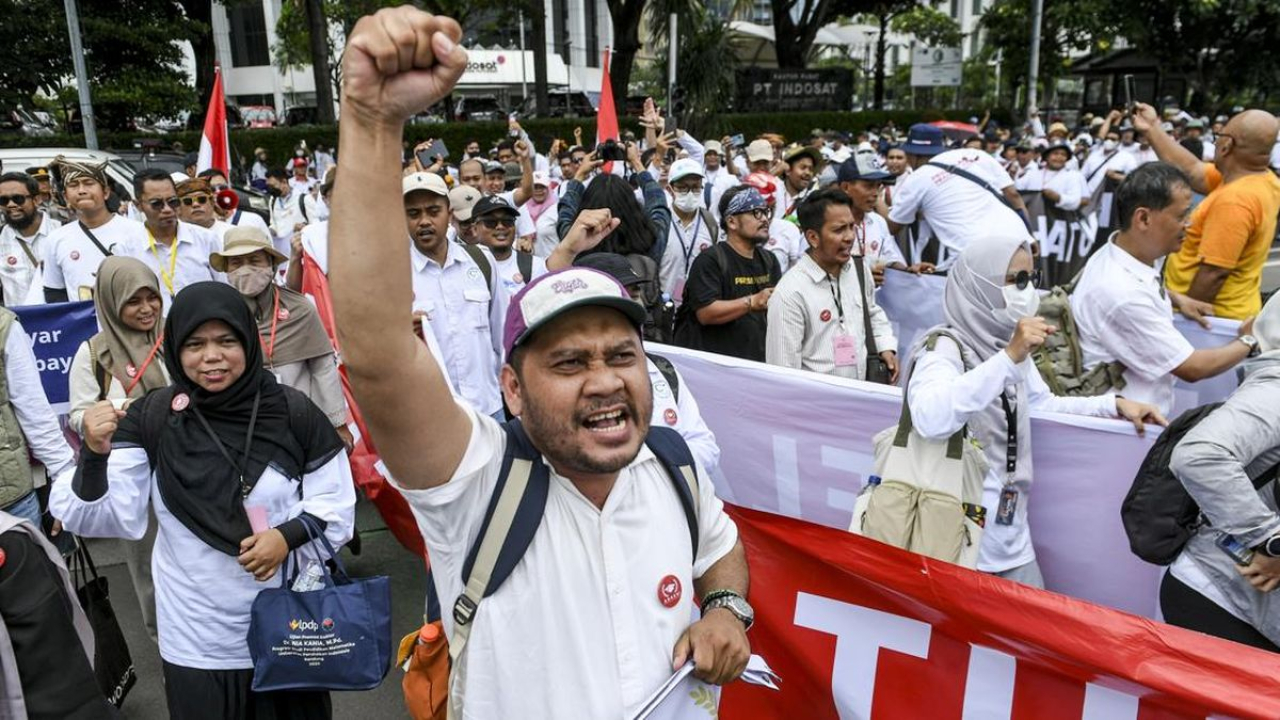 SURABAYAPAGI.COM, Jakarta - Aliansi Dosen Kemdiktisaintek Seluruh Indonesia (ADAKSI) yang menggelar demonstrasi menuntut dicairkannya tunjangan kinerja (tukin), buat aksi teatrikal berupa penampilan tari perang dari Minahasa, Sulawesi Utara.