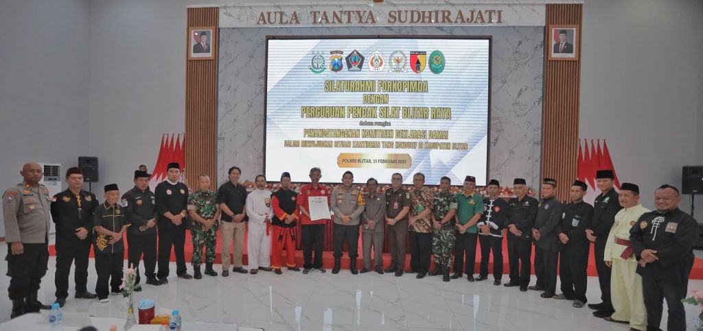 SURABAYAPAGI.COM, Blitar - Sebagai upaya menjaga stabilitas keamanan di wilayah Kabupaten Blitar, Polres Blitar bersama Forkopimda Kab Blitar gelar deklarasi damai bersama Perguruan Silat Se Blitar Raya. Hal tersebut ditandai dengan penandatangan deklarasai damai yang dilakukan di gedung Aula Tantya Sudhirajati Polres Blitar, Kamis (13/2).