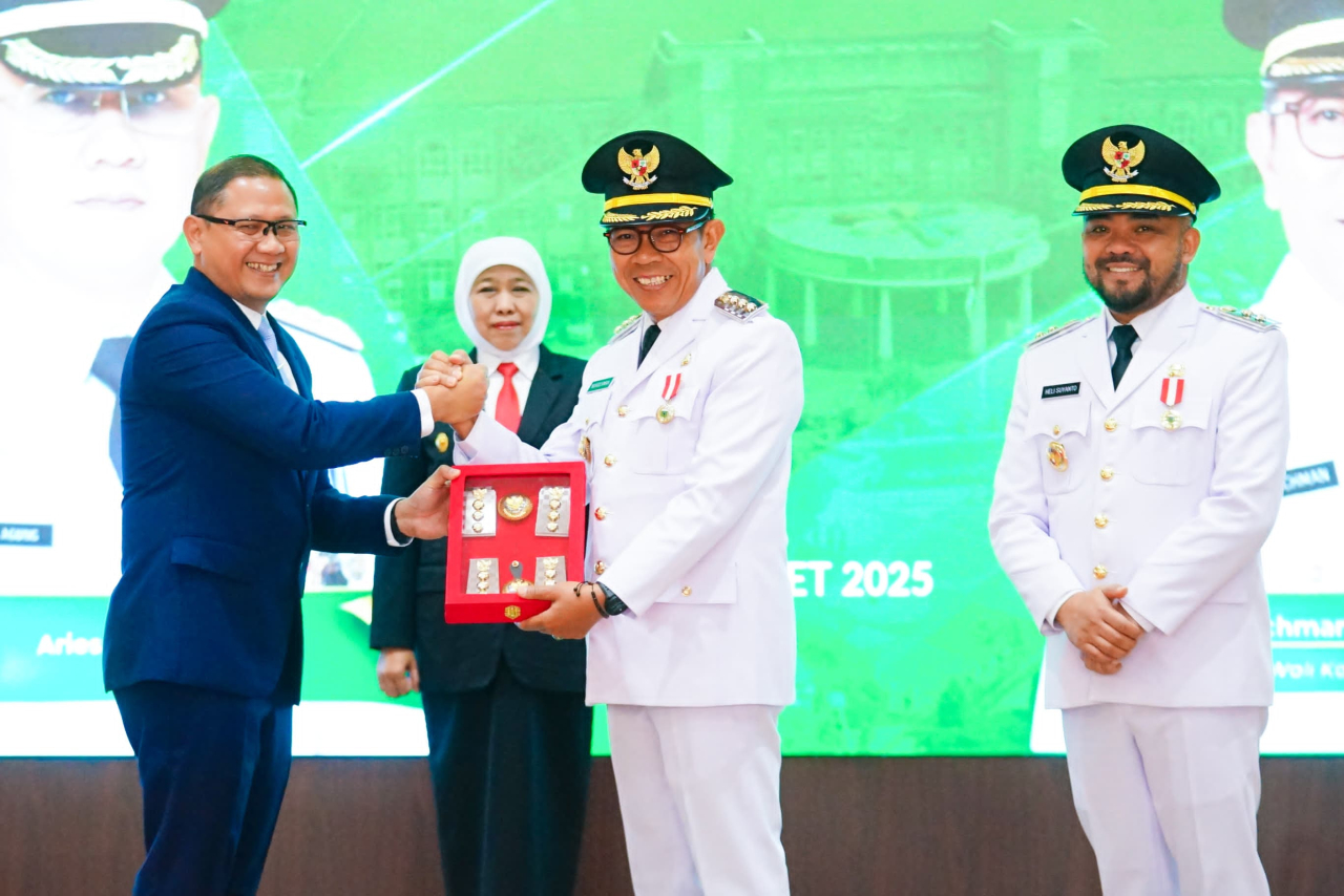 SURABAYAPAGI, Batu - Gubernur Jawa Timur Khofifah Indar Parawansa menghadiri Serah Terima Jabatan (Sertijab) Walikota dan Wakil Walikota Batu periode 2025–2030, di Graha Pancasila Balai Kota Among Tani, Kota Batu, Minggu (2/3).