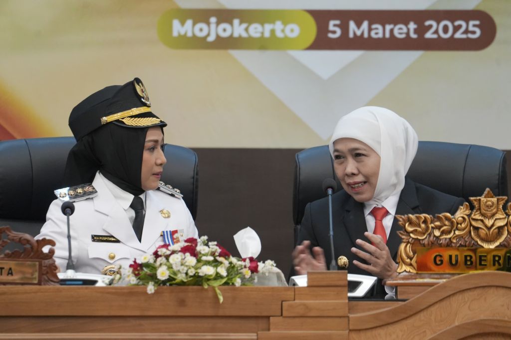 SURABAYAPAGI.COM, Mojokerto - Gubernur Jawa Timur Khofifah Indar Parawansa menghadiri Serah Terima Jabatan (Sertijab) Wali Kota dan Wakil Wal ikota Mojokerto periode 2025–2030 dan Rapat Paripurna Penyampaian Visi Misi Wali Kota dan Wakil Wali Kota Mojokerto Masa Jabatan 2025-2030, di Ruang Rapat Paripurna DPRD Kota Mojokerto, Rabu (5/3/2025).