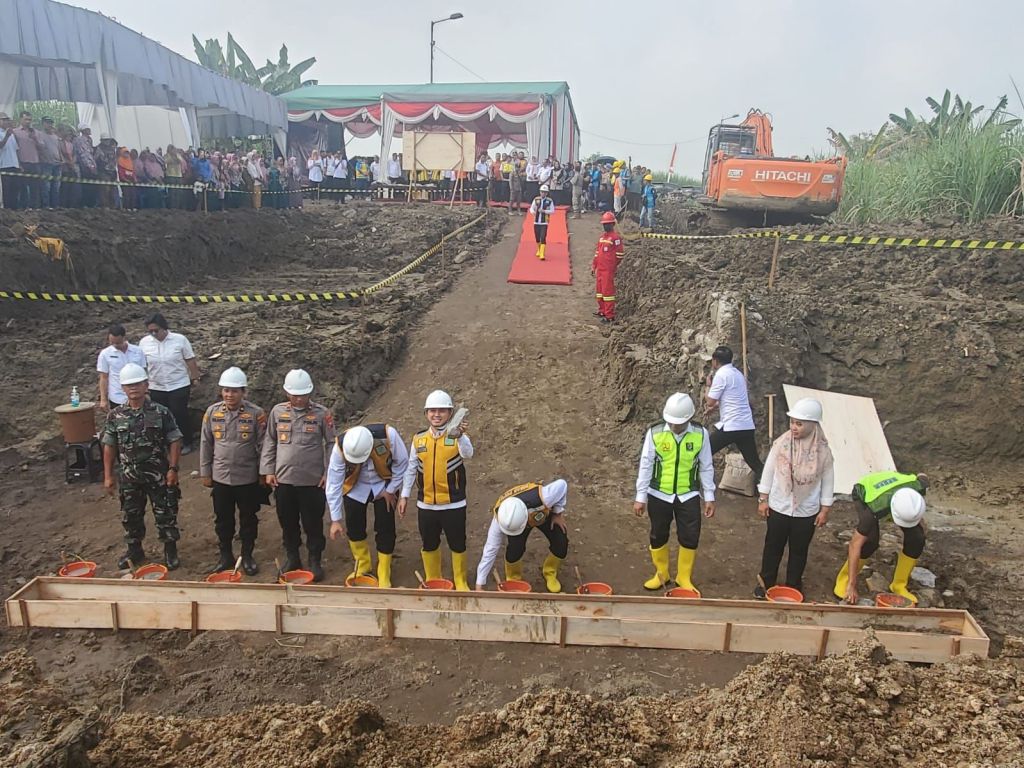 Bupati Mojokerto Muhammad Albaraa (Gus Barra) bersama Wakil Bupati Mojokerto M.Rizal Octavian, yang didampingi Kepala Dinas PUPR, Rinaldi Rizal Sabirin melakukan proses peletakan batu pertama sebagai simbol dimulainya pengerjaan konstruksi jembatan, pada Rabu (16/4/2025).