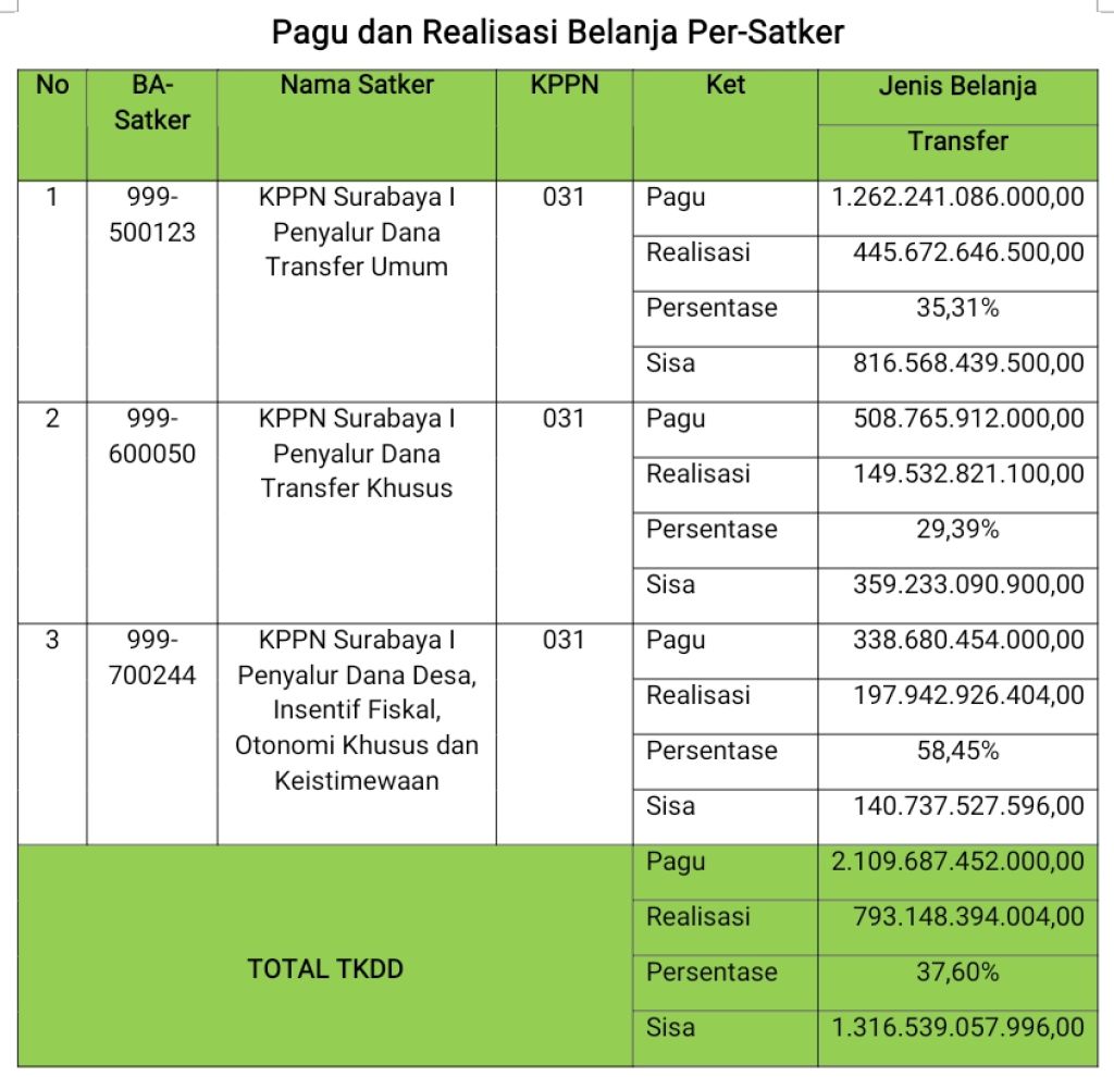 Sampai dengan tanggal 21 Mei 2025, KPPN Surabaya I telah manyalurkan TKDD sebesar Rp793.148.394.004,- atau 37,60�ri total pagu Rp2.109.687.452.000,-.