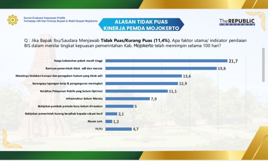 Menariknya, jumlah masyarakat Kabupaten Mojokerto yang menyatakan tidak puas dengan kinerja Gus Barra hanya 11,4 persen dan yang menyatakan tidak tahu atau tidak jelas sebesar 7,5 persen.