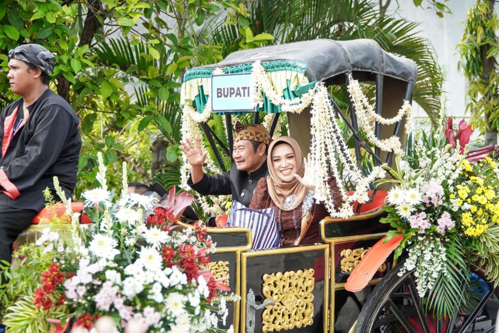 Dalam rombongan kirab tampak Bupati Lamongan Yuhronur Efendi didampingi Ibu Anis Kartika Yuhronur Efendi mengenakan pakaian adat khas Lamongan dengan menaiki kereta kuda (andong) diikuti jajaran Forkopimda, Kepala OPD, dan Camat.