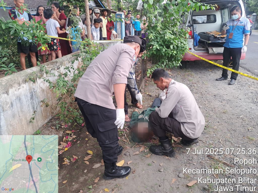 SURABAYAPAGI.COM, Blitar - Senin (7/7) pagi sekitar pukul 07.00 warga Desa/Kecamatan Selopuro Kabupaten Blitar dikejutkan temuan seorang wanita dalam kondisi meninggal dunia dengan posisi terlentang tanpa identitas, atas temuan tersebut, warga segera melapor ke Polsek Selopuro dan diteruskan ke Polres Blitar.