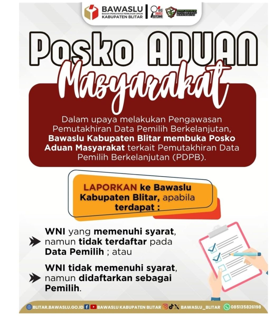 SURABAYAPAGI.COM, Blitar - Sebagai upaya memperkuat pengawasan Pemutakhiran Pemilih berkelanjutan tahun 2025, Bawaslu Kabupaten Blitar membuka Posko Aduan Masyarakat di kantor yang berada di Jalan Ahmad Yani Nomor 44, Kota Blitar.