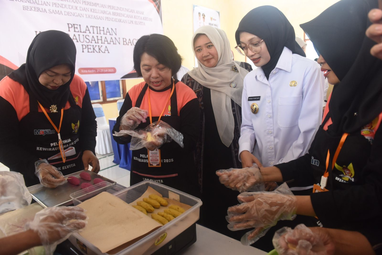 SURABAYAPAGI.COM, Kediri - Wali Kota Kediri Vinanda Prameswati bersama Ketua TP PKK Kota Kediri Faiqoh Azizah Muhammad meninjau langsung kegiatan Pelatihan Kewirausahaan yang digelar di Balai RW Kelurahan Banjarmlati, Rabu (23/7/2025). Pelatihan ini diikuti oleh 46 orang yang merupakan para perempuan kepala keluarga (PEKKA) di tiap kelurahan di Kota Kediri.