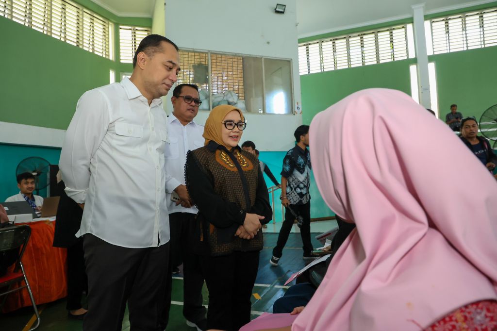 Wali Kota Surabaya Eri Cahyadi didampingi Ketua Tim Penggerak (TP) PKK Kota Surabaya Rini Indriyani dan Kepala Bagian Pemerintahan dan Kesejahteraan Rakyat (Bapemkesra) Kota Surabaya Arief Boediarto, meninjau langsung proses pembagian perlengkapan sekolah di Gelanggang Remaja Surabaya, Kamis (24/7).