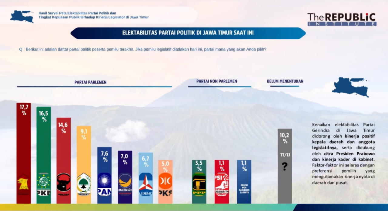 Dalam survei The Republic Institute, elektabilitas Partai Gerindra di angka 17,7 persen. Gerindra mengungguli PKB yang meraih angka 16,5 persen, dan PDIP 14,6 persen. Padahal, pada Pileg 2024 lalu, Gerindra berada di peringkat ke-3 di Jatim baik level DPR RI maupun DPRD provinsi.