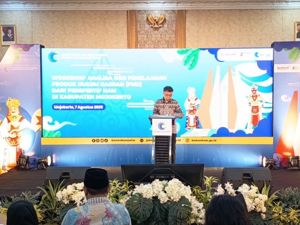 Workshop yang digelar di Hotel Lyn Kota Mojokerto, Kamis (7/8/2025) ini dibuka Kepala Kemenham Kanwil Jatim, Toar R.E. Mangaribi dan dihadiri Sekretaris Daerah Kabupaten Mojokerto, Teguh Gunarko.