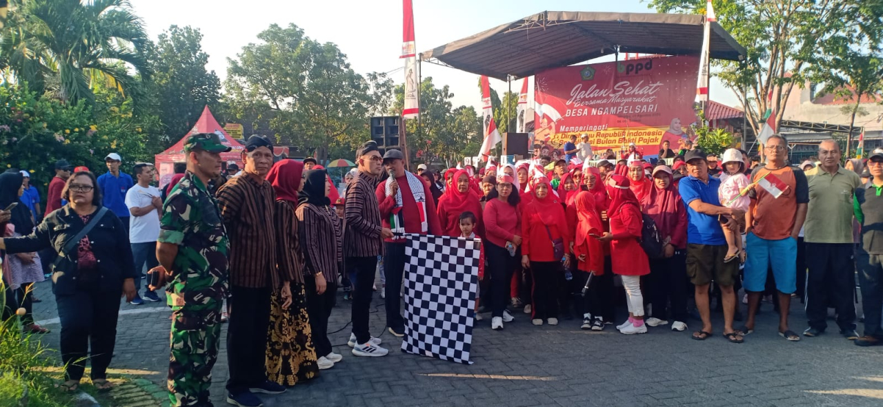 Nuansa HUT ke-80 Kemerdekaan RI begitu kental karena peserta memakai kaus merah putih, serta membawa bendera merah putih. Jalan santai diberangkatkan langsung Kepala Desa Ngampelsari, H. Bambang Eko Sumarsono S,E,. Minggu ( 31/08/2025)