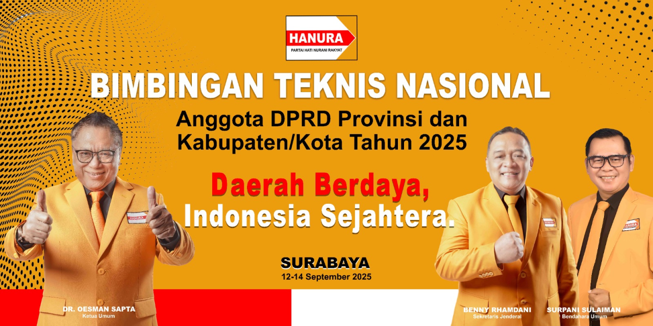 Bambang menambahkan sebelum digelar bimtek di Surabaya, Ketum Hanura Oesman Sapta akan melantik Pengurus DPD Hanura Jatim periode 2025-2030.