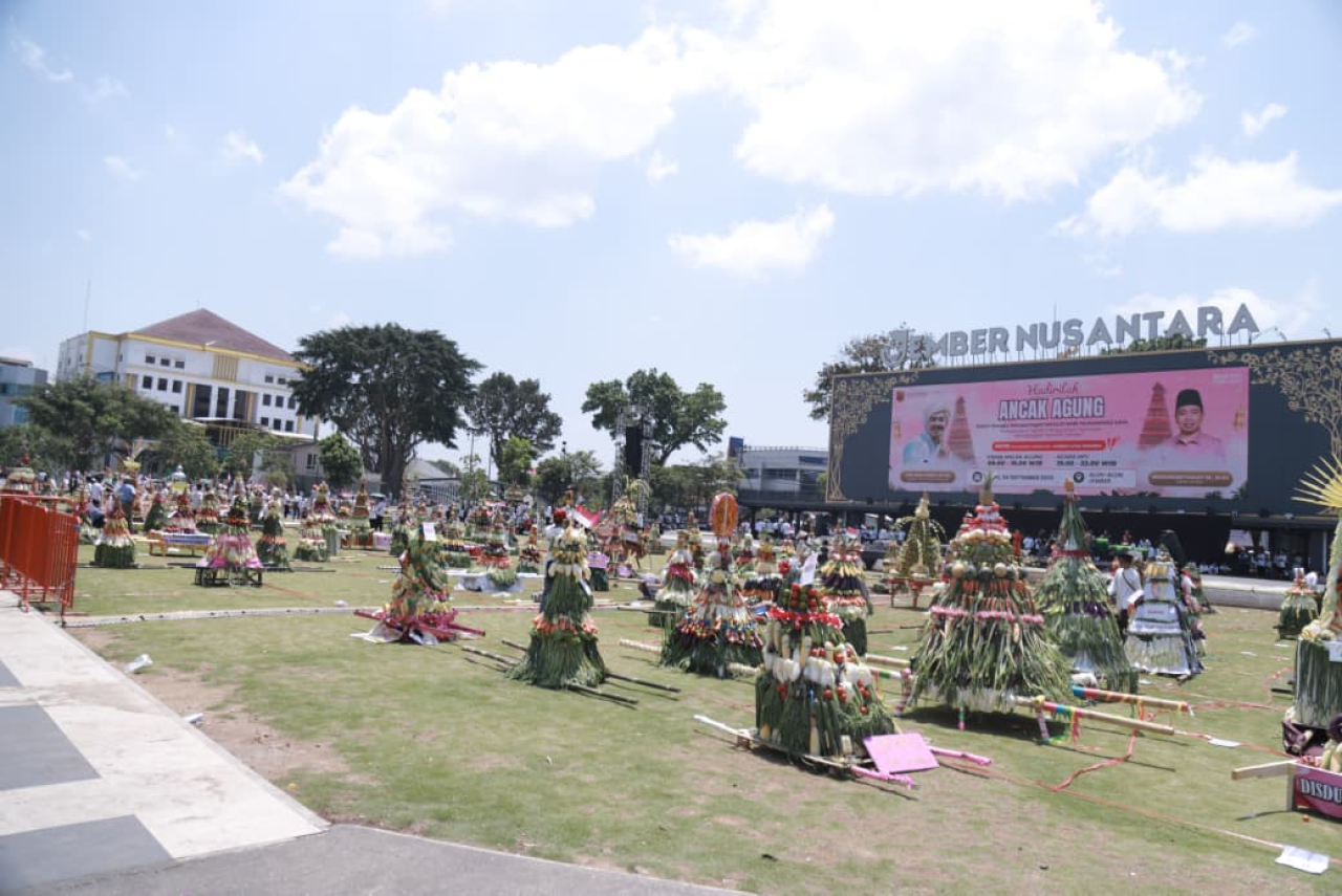Sejak pukul 07.00 WIB, udara di pusat kota telah dipenuhi lantunan ayat-ayat suci dalam Khotmil Qur’an serentak, membuka acara dengan nuansa khidmat dan penuh doa. Disusul kemudian dengan parade budaya kirab 500 gunungan ancak hiasan megah dari hasil bumi yang diarak dengan takzim menuju pusat kota, menandai puncak kemeriahan acara.