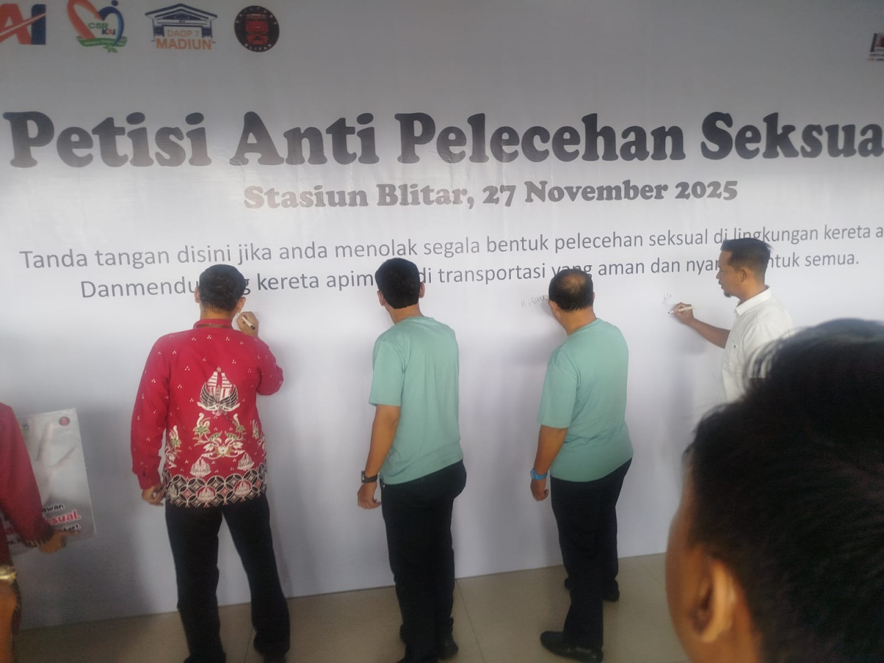 "Kegiatan ini juga diisi dengan penandatanganan petisi sebagai bentuk dukungan dari masyarakat dan pelanggan kereta api untuk mengecam setiap tindakan pelecehan seksual, baik di stasiun maupun di atas kereta api yang dilakukan oleh seluruh peserta dan pelanggan KA yang berada di Stasiun Blitar." Ungkap Zaenul dalam relisnya.