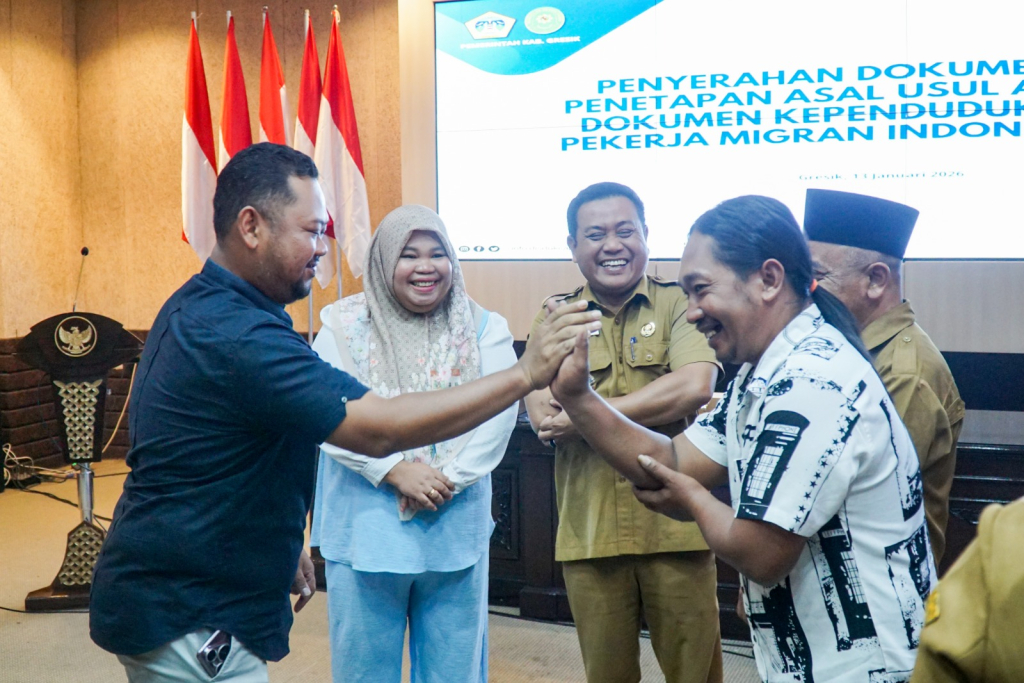 Penyerahan dokumen tersebut berlangsung di Ruang Putri Cempo, Kantor Bupati Gresik, Selasa (13/1/2026). Salah satu penerima manfaat adalah Sugi Utomo, PMI asal Desa Sekapuk, Kecamatan Ujungpangkah, yang didampingi istrinya, Marwah. Pasangan tersebut menerima sejumlah dokumen penting, termasuk akta kelahiran anak.