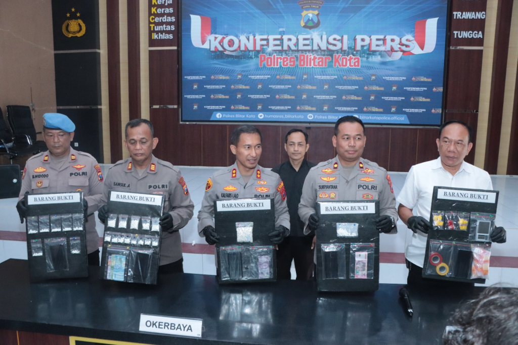 “Pengungkapan kasus ini merupakan wujud komitmen Polres Blitar Kota dalam menekan dan memberantas peredaran narkoba dan obat-obatan berbahaya. Untuk itu kami mengajak masyarakat untuk terus berperan aktif dalam memberikan informasi, dngan call center 110.” pungkas AKBP Kalfaris yang didampingi Waka Polres Blitar Kota Kompol Subiantana, Kasat Reskoba, AKP Rokhani, Kadi Humas AKP Samsul Anwar. les