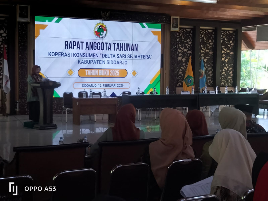 SURABAYAPAGI.com, Sidoarjo - Rapat Anggota Tahunan (RAT) Koperasi Konsumen Delta Sari Sejahtera Tahun Buku 2025 digelar di Pendopo Delta Wibawa, Sidoarjo, Kamis (12/02/2026). Untuk acara di awali dengan pemberian santunan kaum duafa dan yayasan anak yatim dilakukan langsung oleh penasehat Koperasi Konsumen Delta Sejahtera, dr. Hj. Sriatun Subandi, serta sambutan Ketua Koperasi Konsumen Delta Sari Sejahtera.