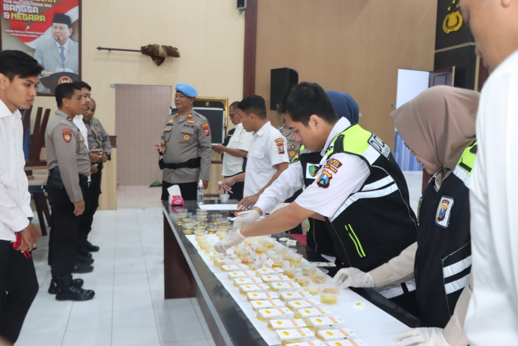 Tampak para peserta lakukan tes urine dan hasil tes urine nya dimasukan dalam botol yang berjajar dan diserahkan ke petugas Sidokes untuk pelaksanaan tes Urine, kegiatan penyerahan dan pemeriksaan hasil tes Urine di saksikan langsung Kapolres Blitar AKBP Kalfaris Lalo didampingi Wakapolres Blitar Kota Kompol Subiantana.