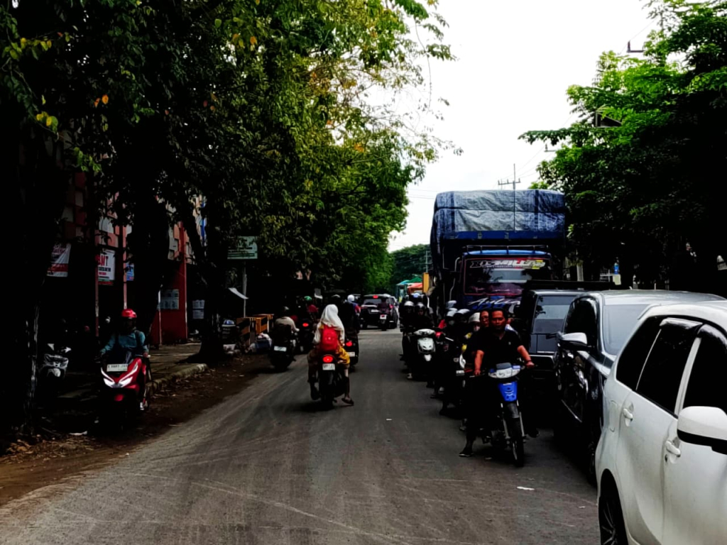 Pantauan di lokasi, antrean kendaraan roda dua maupun roda empat mengular hingga ratusan meter, terutama dari arah selatan dan barat pasar.